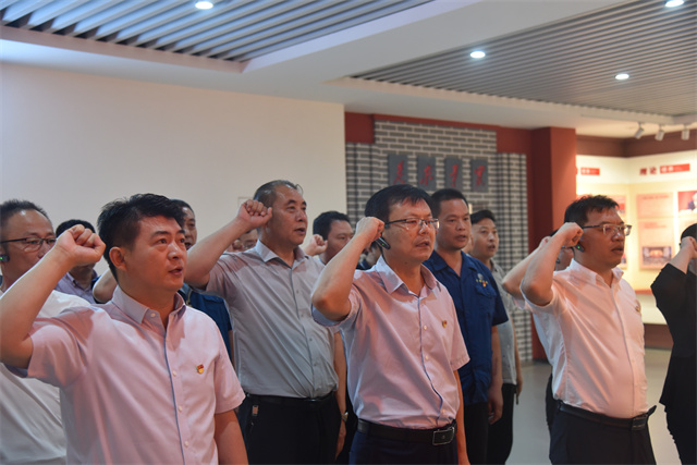 參觀最后,全體黨員在公司黨委書記、董事長盛守祥的帶領(lǐng)下,舉起右拳面對黨旗,重溫了入黨誓詞。