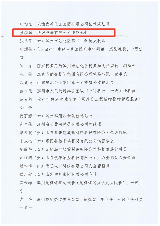 近日,濱州市總工會(huì)發(fā)布了“關(guān)于2023年濱州市五一勞動(dòng)獎(jiǎng)和濱州市工人先鋒號的通報(bào)”,對獲得濱州市五一勞動(dòng)獎(jiǎng)狀的無棣鑫岳燃化有限公司等26個(gè)單位,獲得濱州市五一勞動(dòng)獎(jiǎng)?wù)碌亩?90名個(gè)人,獲得濱州市工人先鋒號的濱州中裕食品有限公司面條三車間等30個(gè)集體予以通報(bào)表揚(yáng)。其中,公司花布車間印花機(jī)機(jī)長張頌超榮獲2023年濱州市五一勞動(dòng)獎(jiǎng)?wù)隆?br />