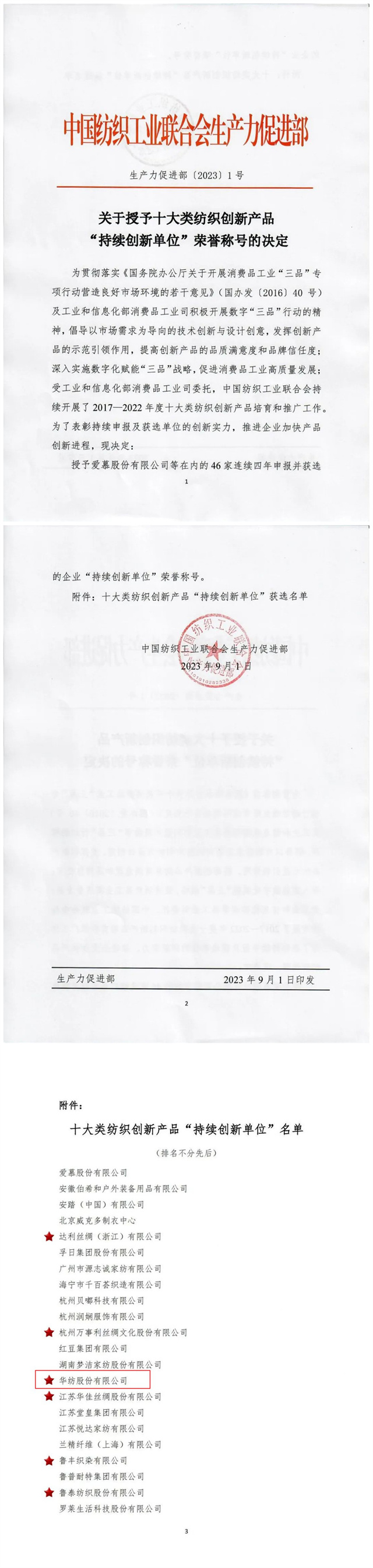 為表彰持續(xù)申報(bào)及獲選單位的創(chuàng)新實(shí)力,推進(jìn)企業(yè)加快產(chǎn)品創(chuàng)新進(jìn)程。近日,中國(guó)紡織工業(yè)聯(lián)合會(huì)生產(chǎn)力促進(jìn)部發(fā)布“關(guān)于十大類紡織創(chuàng)新產(chǎn)品‘持續(xù)創(chuàng)新單位’榮譽(yù)稱號(hào)的決定”,授予華紡股份有限公司等在內(nèi)的46家連續(xù)四年申報(bào)并獲選的企業(yè)“持續(xù)創(chuàng)新單位”榮譽(yù)稱號(hào)。