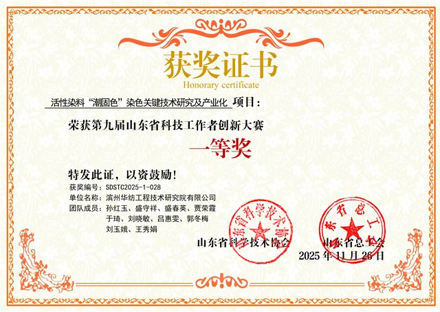 近日,在第九屆山東省科技工作者創(chuàng)新大賽決賽中,公司工程技術(shù)研究院團隊研發(fā)的“活性染料‘潮固色’染色關(guān)鍵技術(shù)研究及產(chǎn)業(yè)化”項目,經(jīng)多輪嚴格評審,從282個入圍決賽的優(yōu)秀項目中脫穎而出,榮獲大賽一等獎。